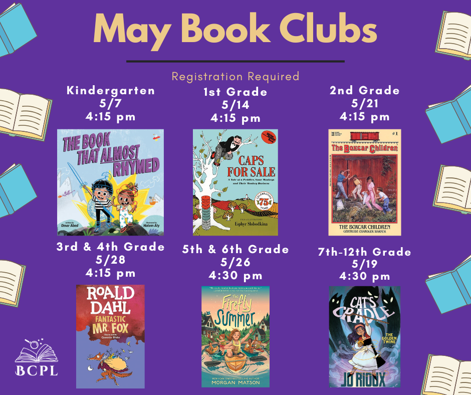Youth Book Clubs for grades Kindergarten-12th. Sign up by calling us at 518-399-8174 or using the online calendar and we will reserve a copy of the book for you.