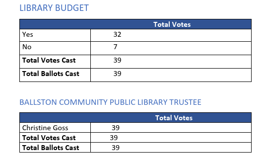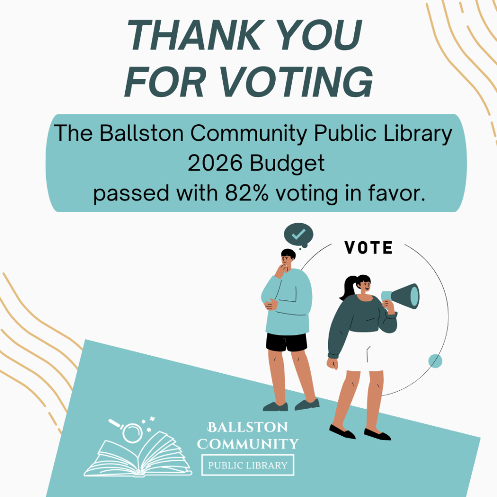 The Board of Trustees of the Ballston Community Public Library will have the 2026 Budget Hearing on Wednesday, September 24th at 6:45 PM. A presentation about the 2026 proposed budget and prospective trustees will be provided.